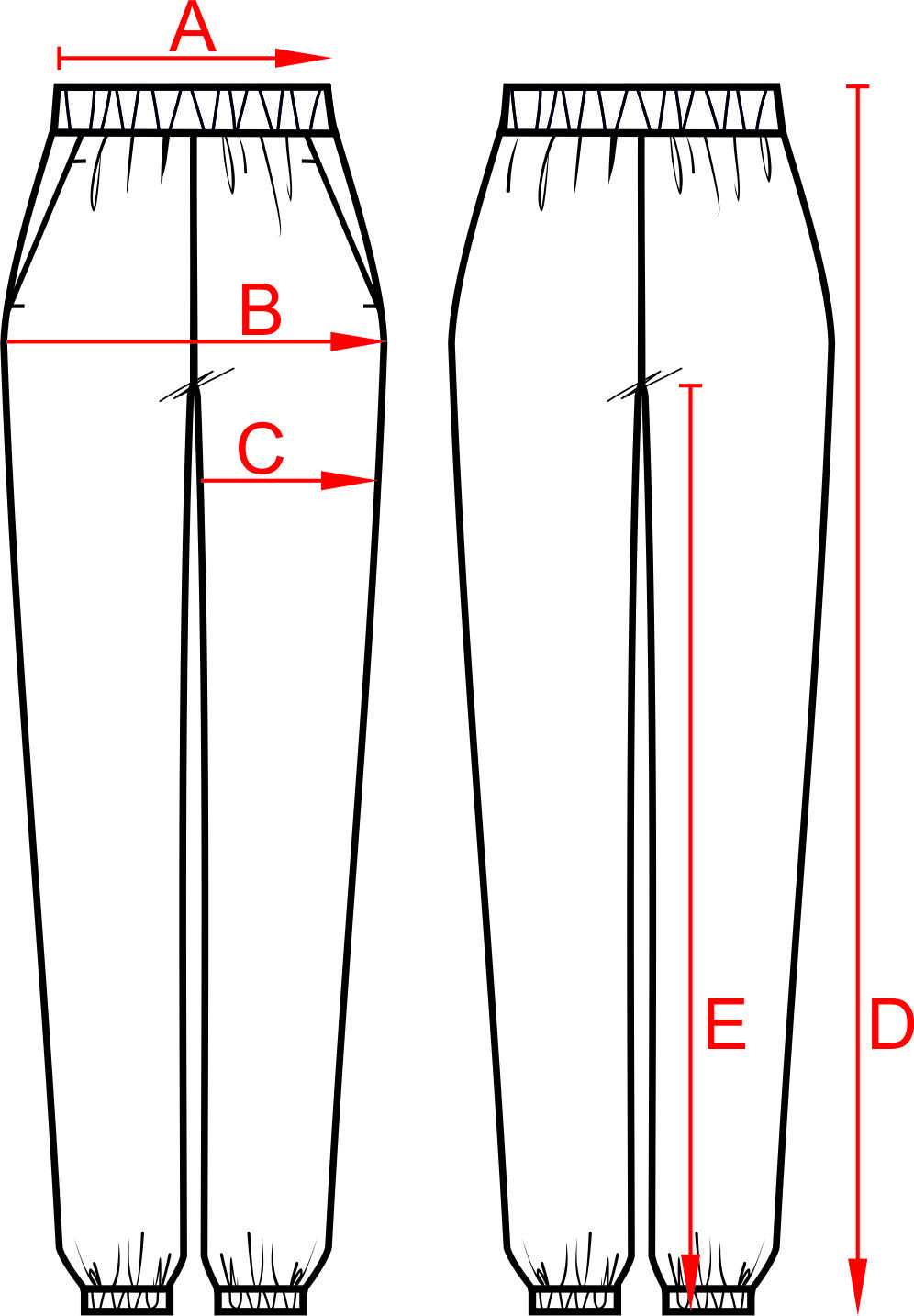 Пояс отрезной из основного материала шириной 5 см, внутри резинка. По низу брюк, в подгибке - резинка шириной 3 см.